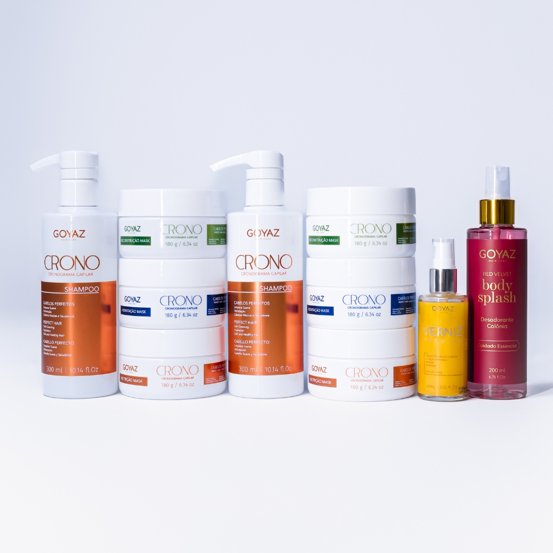 O kit completo oferece cuidado integral para os cabelos e corpo. O Cronograma Capilar promove hidratação, nutrição e reconstrução, garantindo fios saudáveis, macios e fortes. O Verniz Premium sela as cutículas, proporciona brilho intenso e maciez, controlando o frizz. O Red Velvet Body Splash oferece uma fragrância luxuosa e sofisticada, deixando um rastro marcante e duradouro.